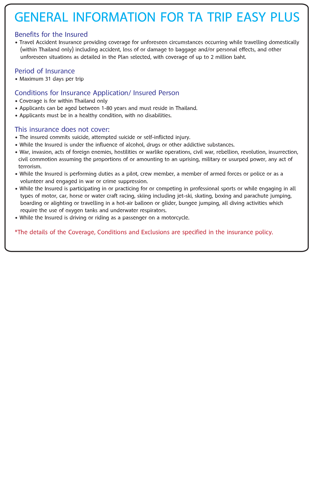 • ให้ความคุ้มครองการเสียชีวิตจากอุบัติเหตุสูงสุด 1,000,000 บาท